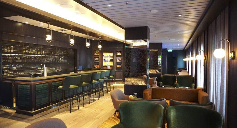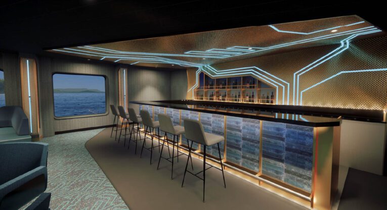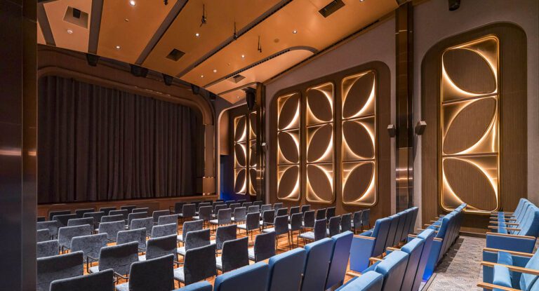 As the smaller of the ship’s two theaters, the intimate Blaue Flora carries forward the concept of a flexible, multi-use entertainment venue. Scaled for chamber concerts, lectures, and dance performances, the space features tiered rear seating and removable chairs near the stage, allowing it to transform for dance classes, social events, and gatherings. A double-height volume lends a sense of grandeur, while the design—warm wood, gold accents, and rich blue fabrics—evokes the elegance of classic ocean liners. Sculptural wall petals double as acoustic panels, enhancing both the visual and auditory experience. Adjacent to the theater, a bar and lounge invite guests to enjoy live music or relax with ocean views throughout the day.