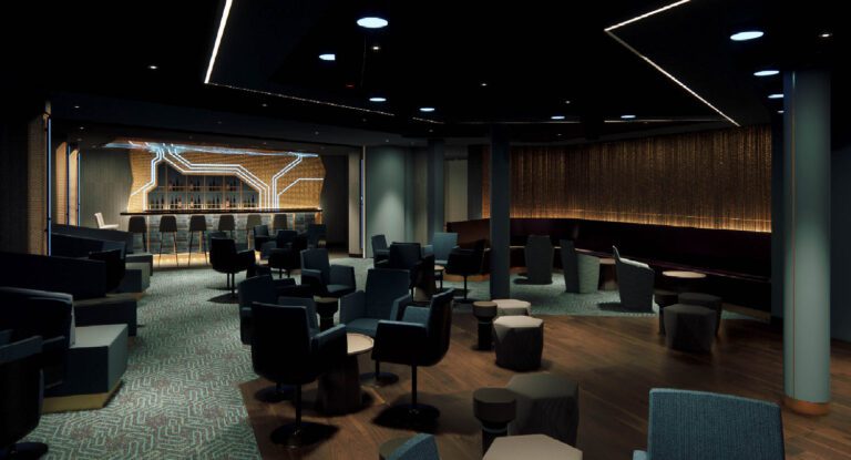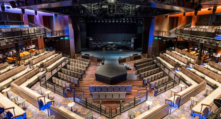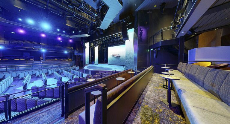 The Main Theater reimagines traditional planning to support diverse programming in a flexible, multi-use space. Its hexagonal layout enables multiple stage and seating configurations—functioning as a classic theater, center-stage venue, or dance hall with removable orchestra seats. Lounge seating on the main level supports dinner theater experiences. Inspired by Hamburg’s industrial textures, the design balances formality with casual comfort. Back-of-house areas are among the largest at sea, offering ample space and flexibility for performers and production teams.
